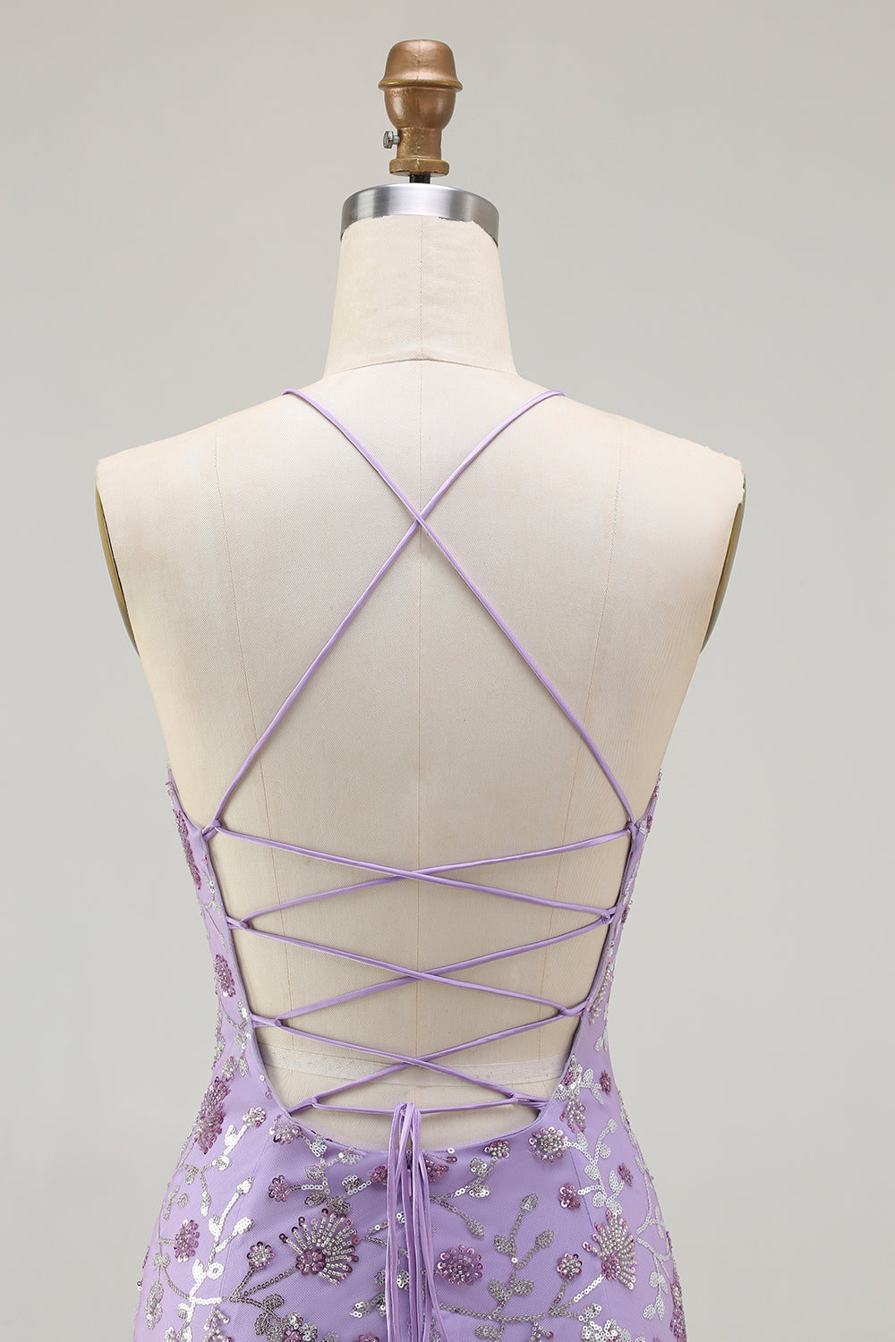 Sparkly Floral Purple Spaghetti Straps Mermaid Long Prom Dress with Slit