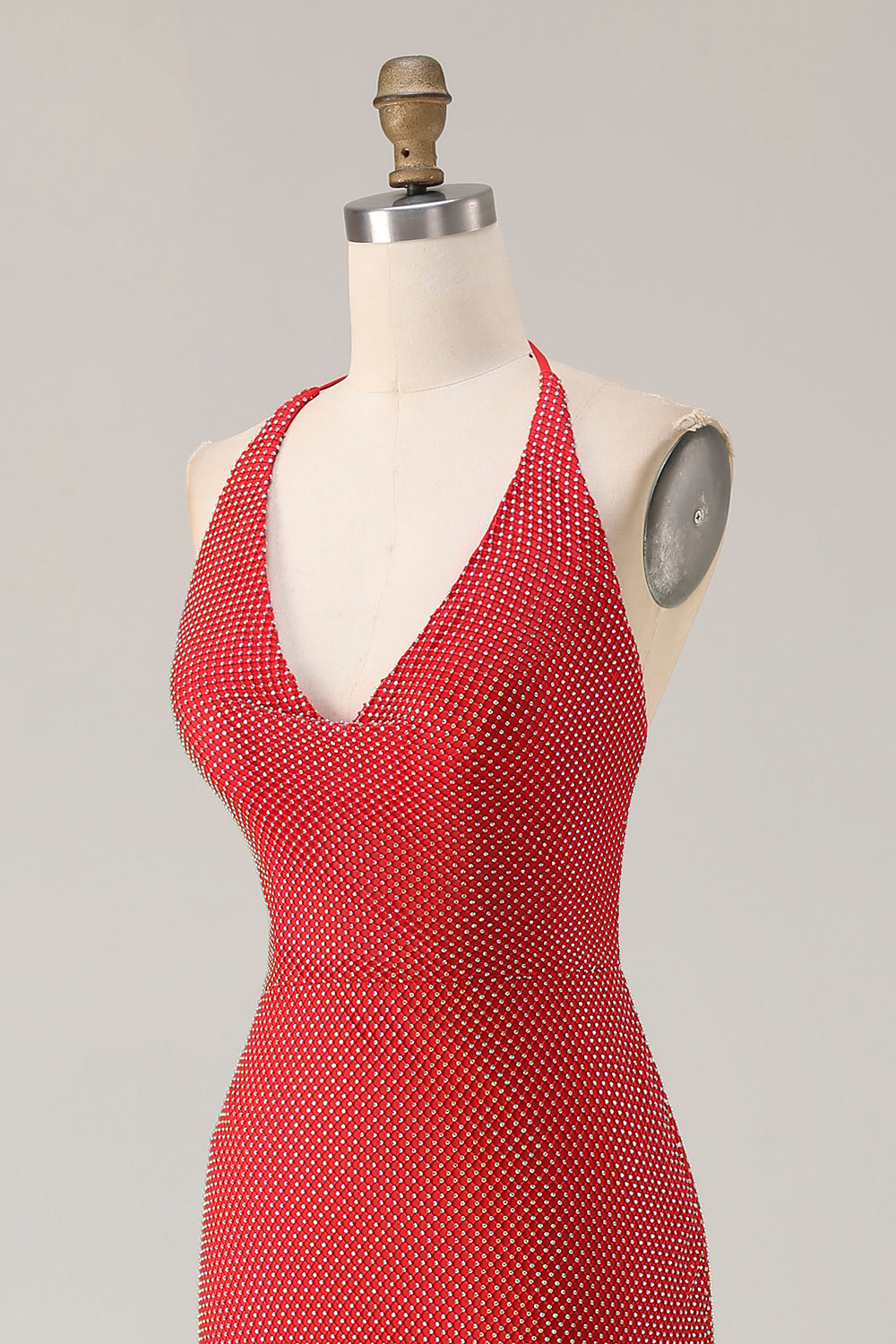 Sparkly Red Mermaid Beaded Halter Long Prom Dress with Slit