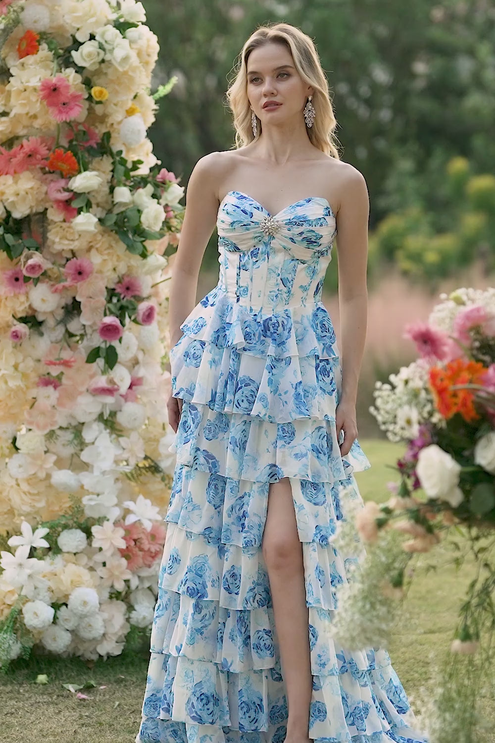 White and Blue Flower Tiered Long Corset Prom Dress with Slit
