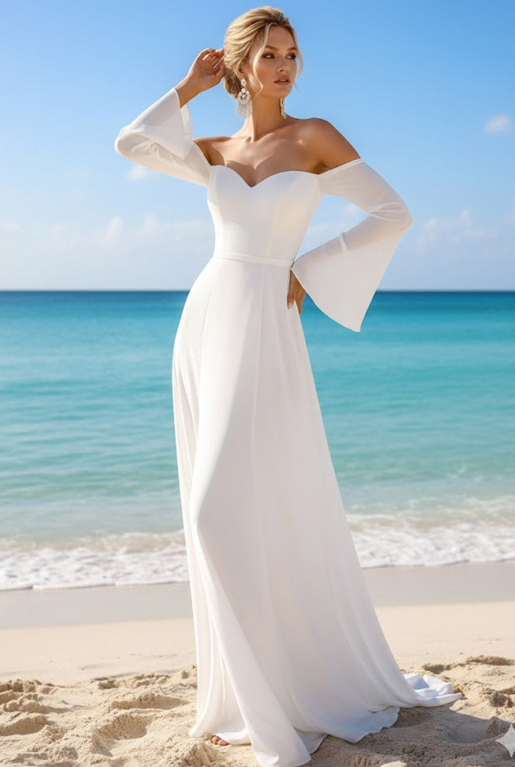 White Chiffon Off the Shoulder Flare Sleeves Long Beach Wedding Dress
