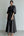 This sophisticated A-line gown in classic black features a high neckline and graceful short sleeves, flowing into a floor-length silhouette. The tailored bodice skims the figure before cascading into a gently flared skirt, with discreet side-seam pockets adding unexpected practicality...