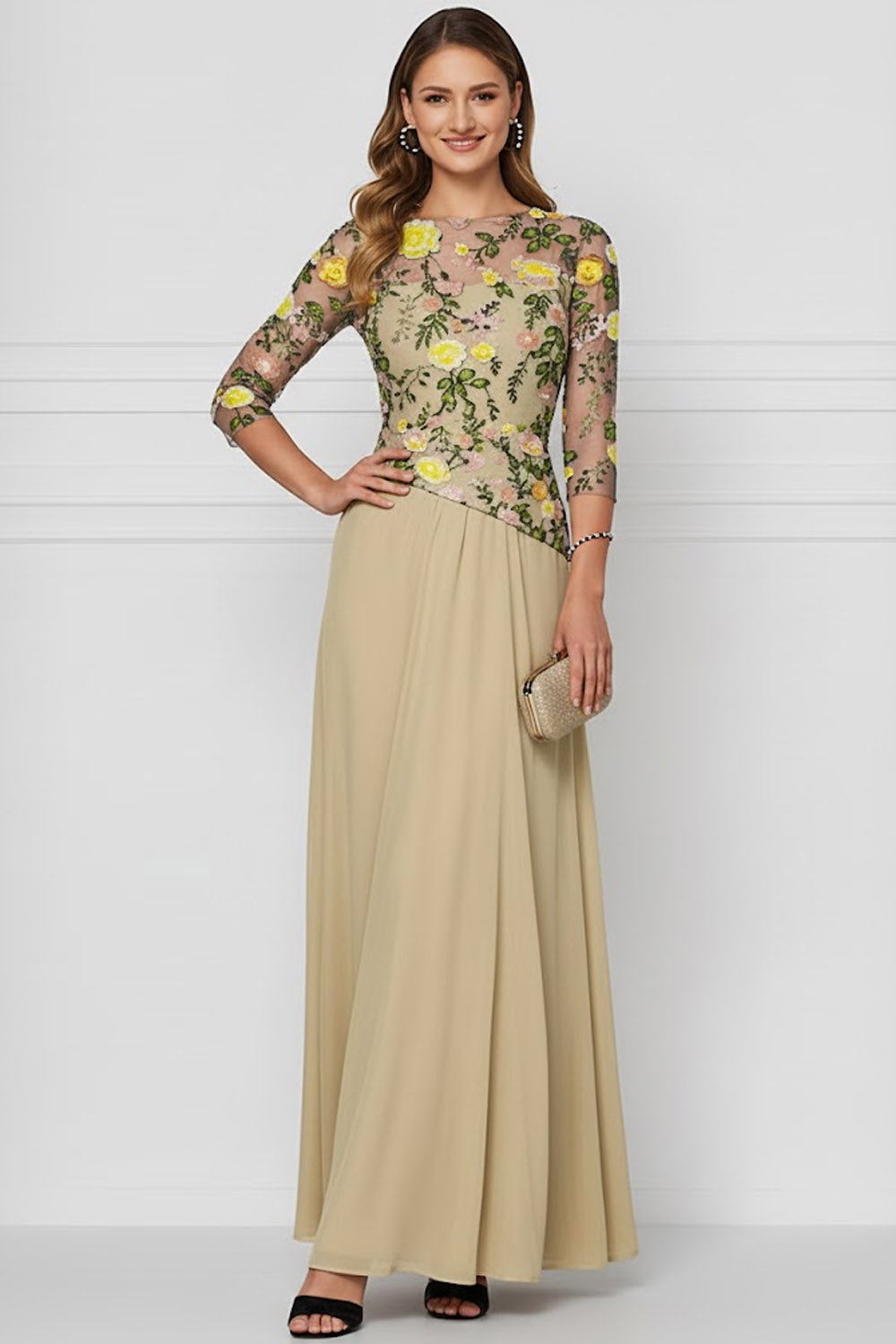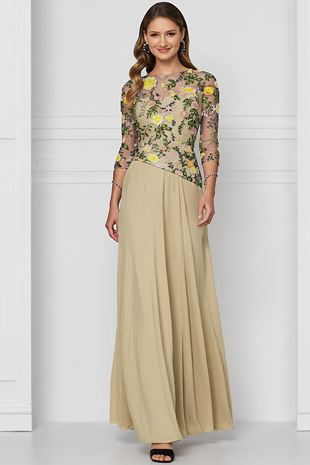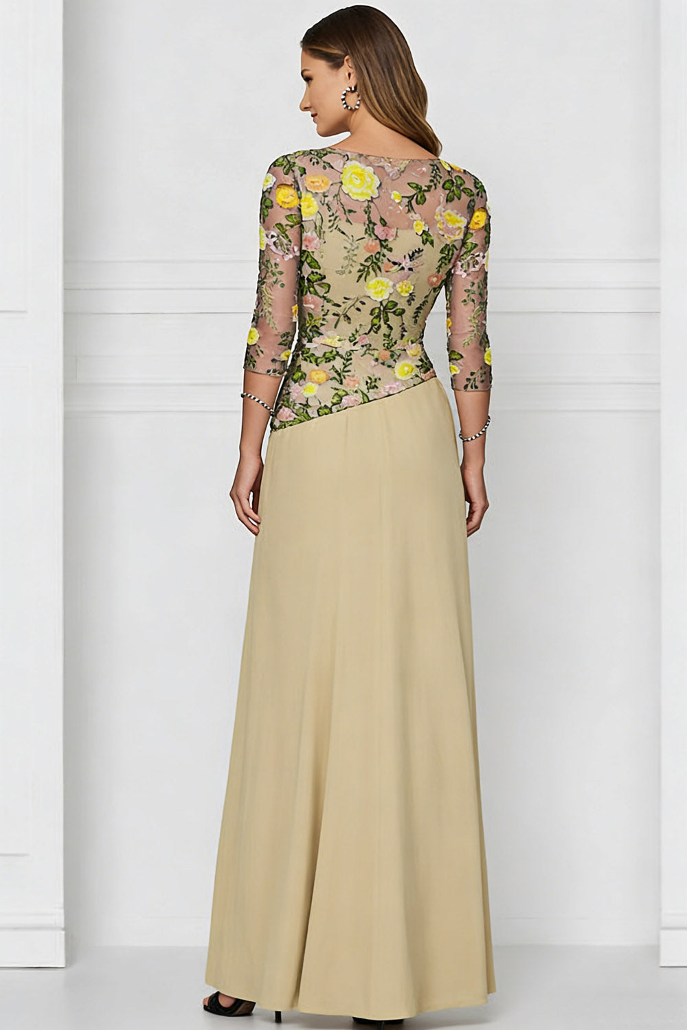Floral Dark Yellow Bateau Neck Long Mother of the Bride Dress
