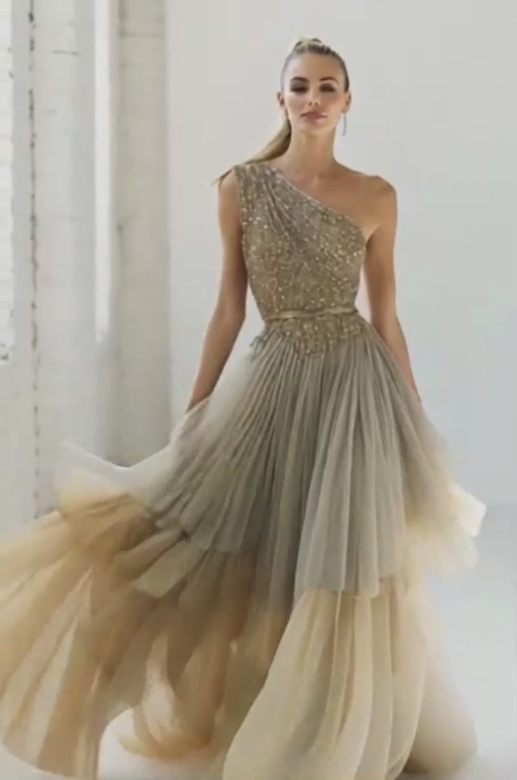 Brown Pleated Tulle A Line Long Wedding Guest Dress with Sequins