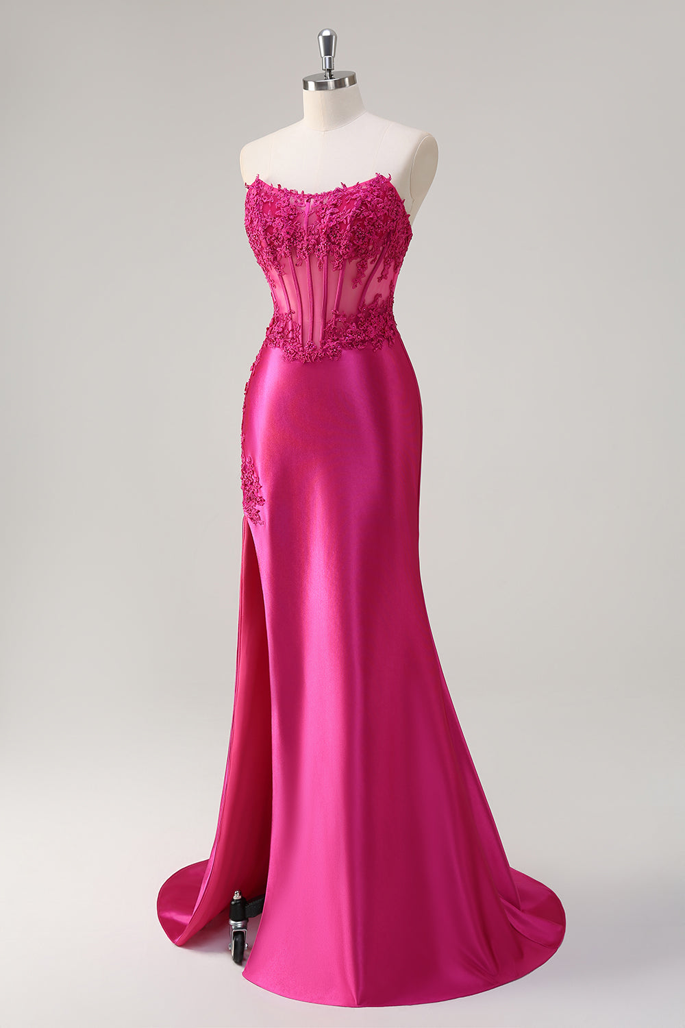 Fuchsia Strapless Applique Mermaid Satin Prom Dress with Slit