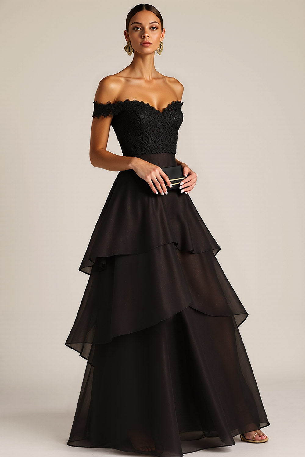 Black Tiered Princess Ruffled Lace Maxi Prom Dress