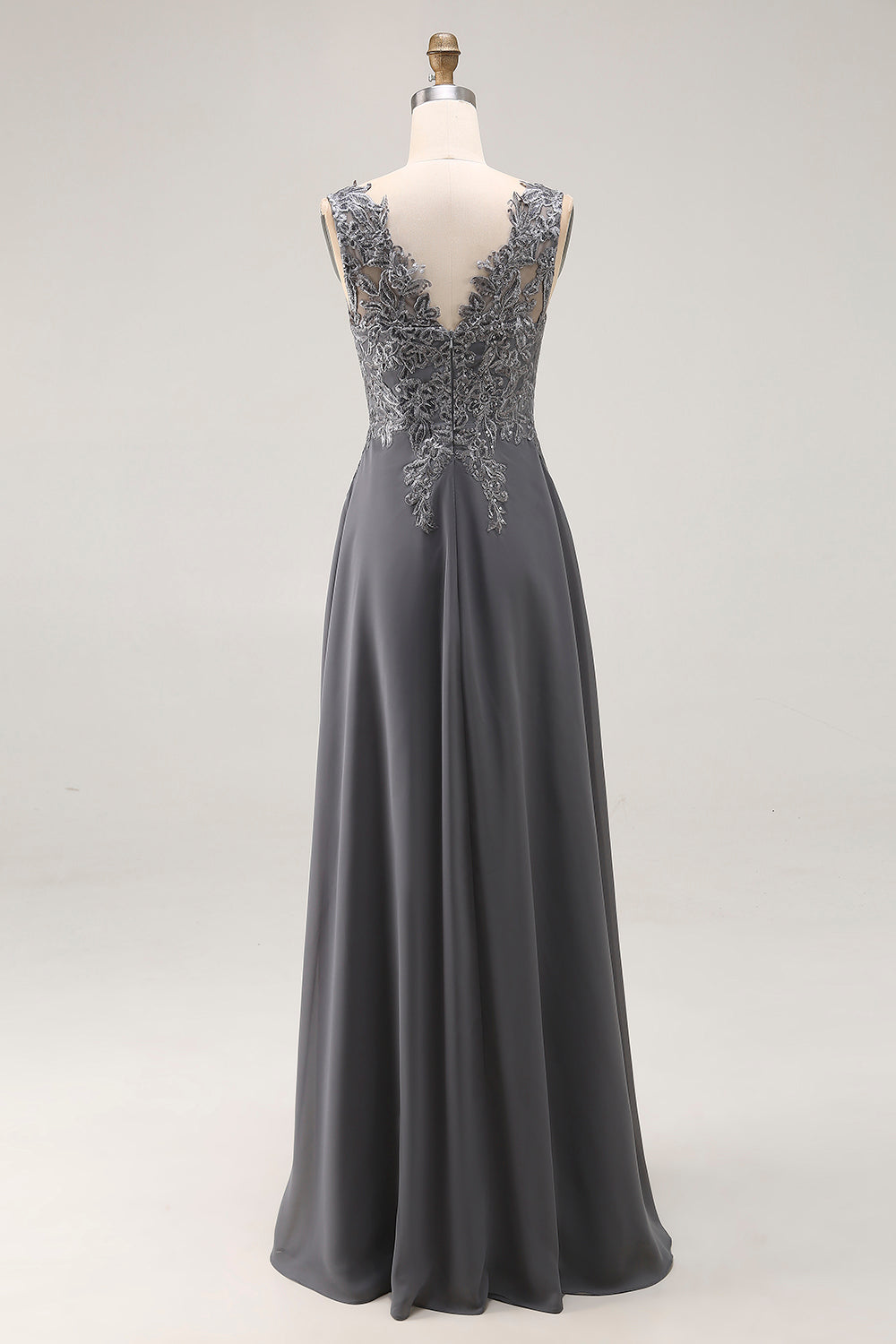 Charcoal A Line Applique V-Neck Long Mother of the Bride Dress with Slit