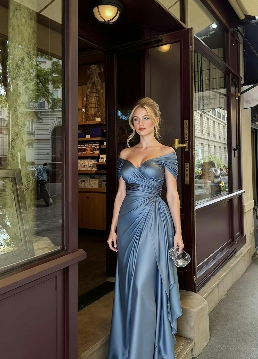 This graceful maxi dress in a soft grey-blue hue features a flattering off-the-shoulder neckline and delicate ruching that drapes effortlessly along its slender sheath silhouette. Crafted from lustrous satin, the floor-length design skims the figure with refined simplicity, making it an ideal choice for weddings, galas, or formal dinners. Understated yet unmistakably chic, it ensures you move with ease and elegance on every special occasion.
