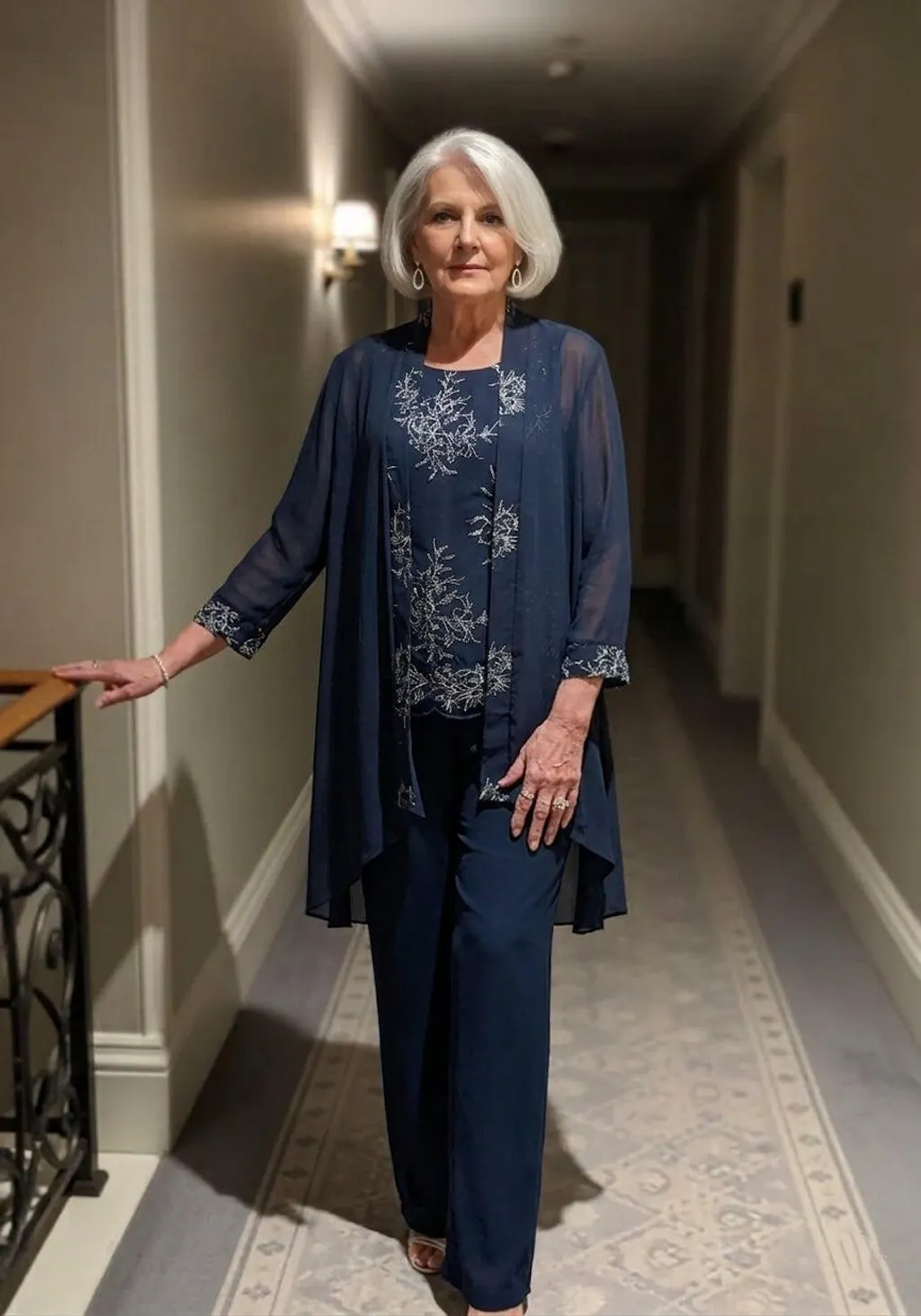 This elegant pantsuit is the perfect blend of sophistication and style. The set includes a tailored sleeveless top, a matching wide-leg pant, and a sheer, flowy jacket adorned with delicate appliqués. The intricate floral appliqués add a touch of elegance, making this outfit ideal for weddings, formal occasions, and special events. The lightweight, breathable fabric ensures comfort throughout the day, while the flattering fit enhances the silhouette. The open-front jacket drapes beautifully, creating a graceful and refined look. This timeless ensemble is designed for modern mothers who want to exude confidence and class on their daughter's special day.