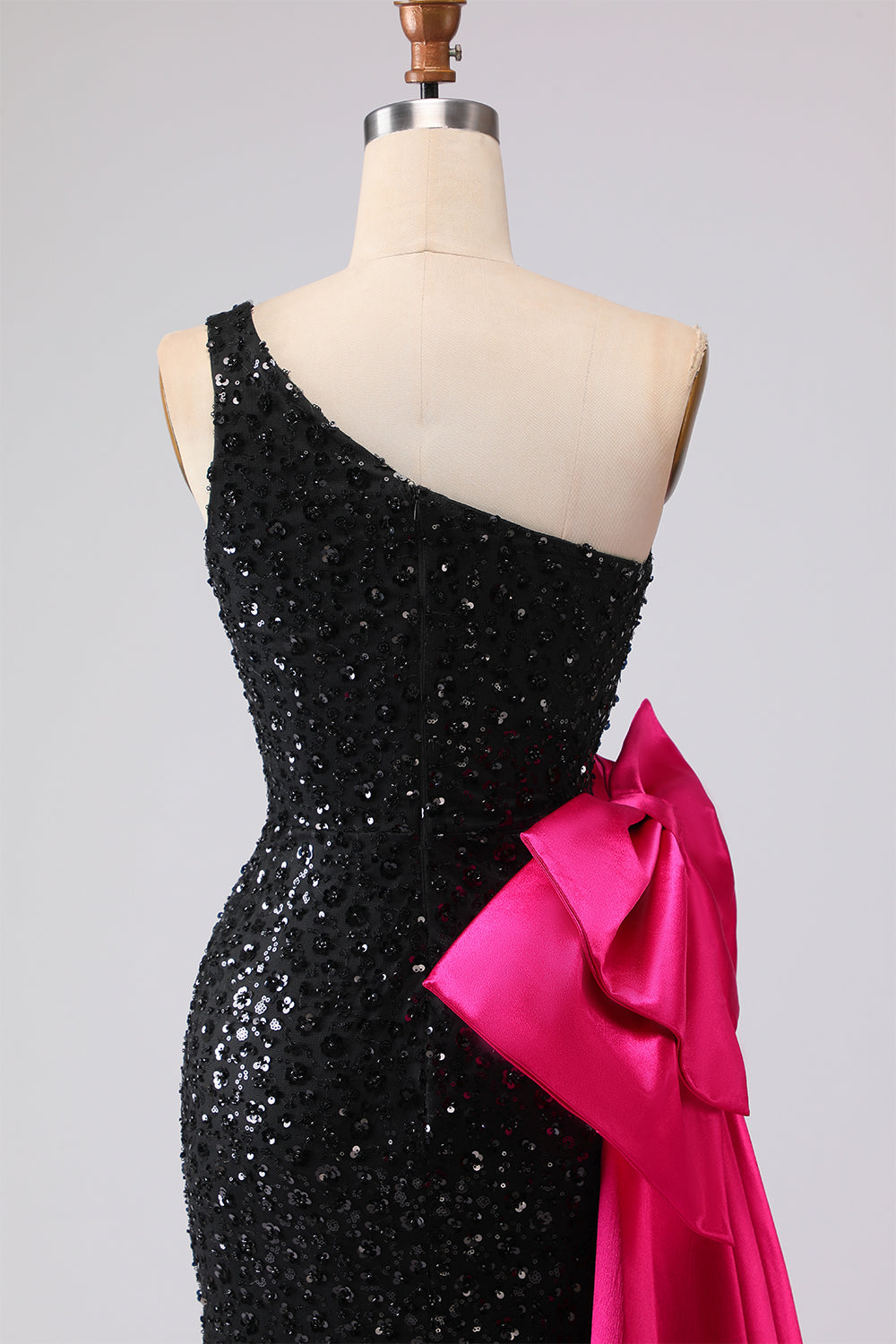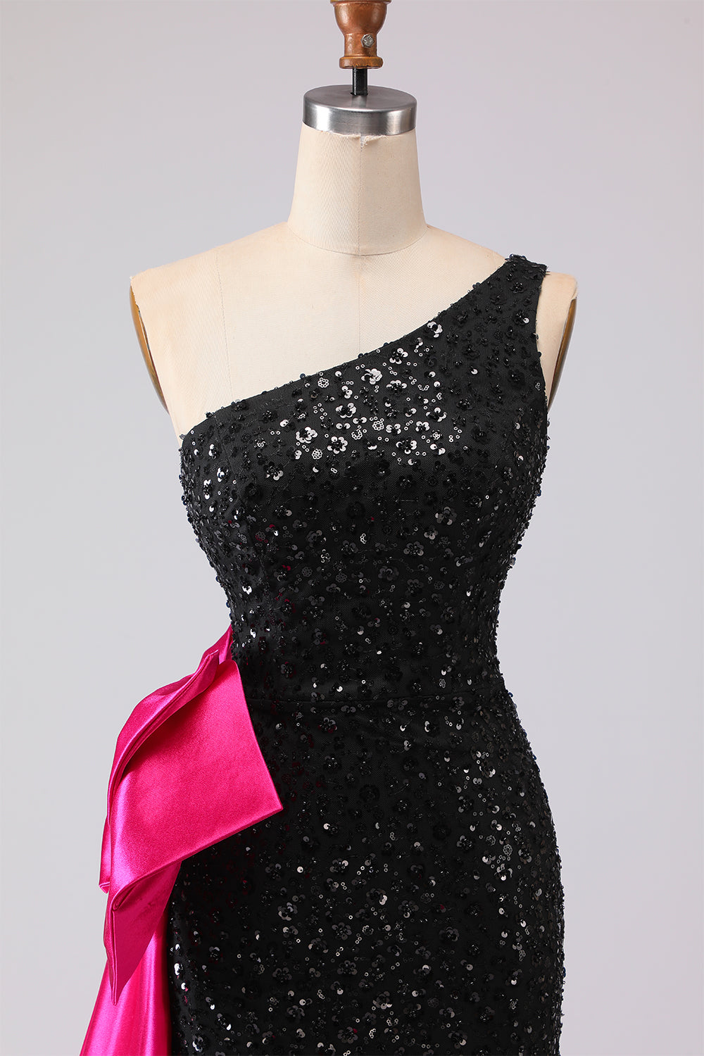 Sparkly Black Sequin Mermaid One Shoulder Long Prom Dress with Side Cape