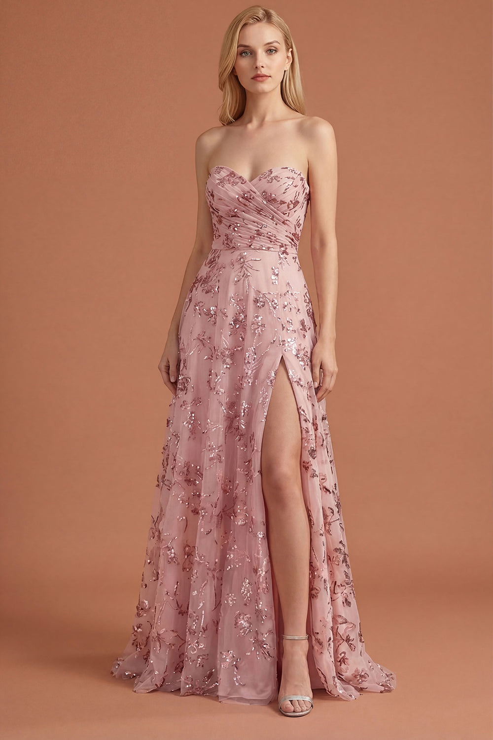 Blush Floral Appliqued A Line Sweetheart Long Prom Dress with Slit