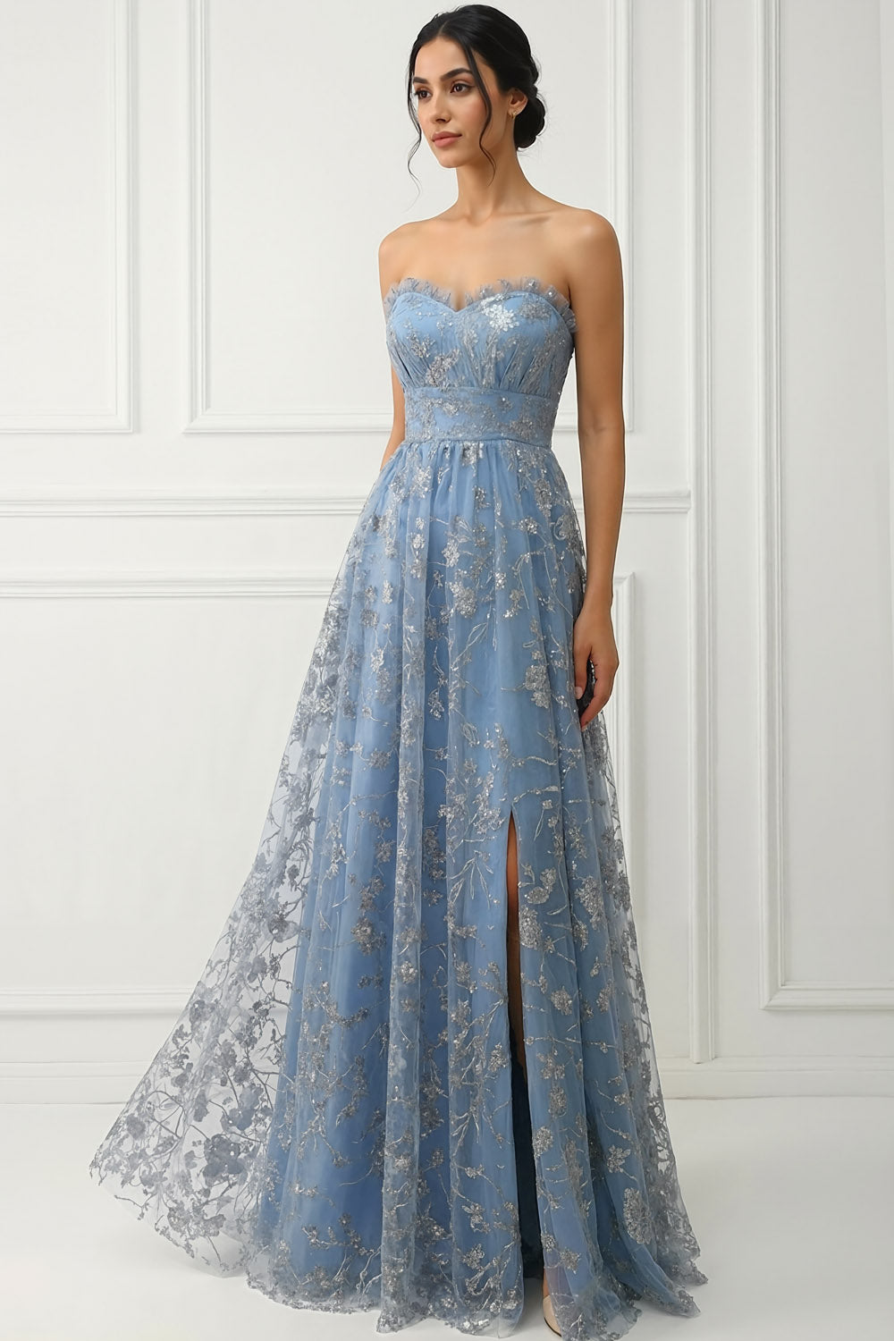Floral Grey Blue Sweetheart A Line Long Prom Dress with Slit
