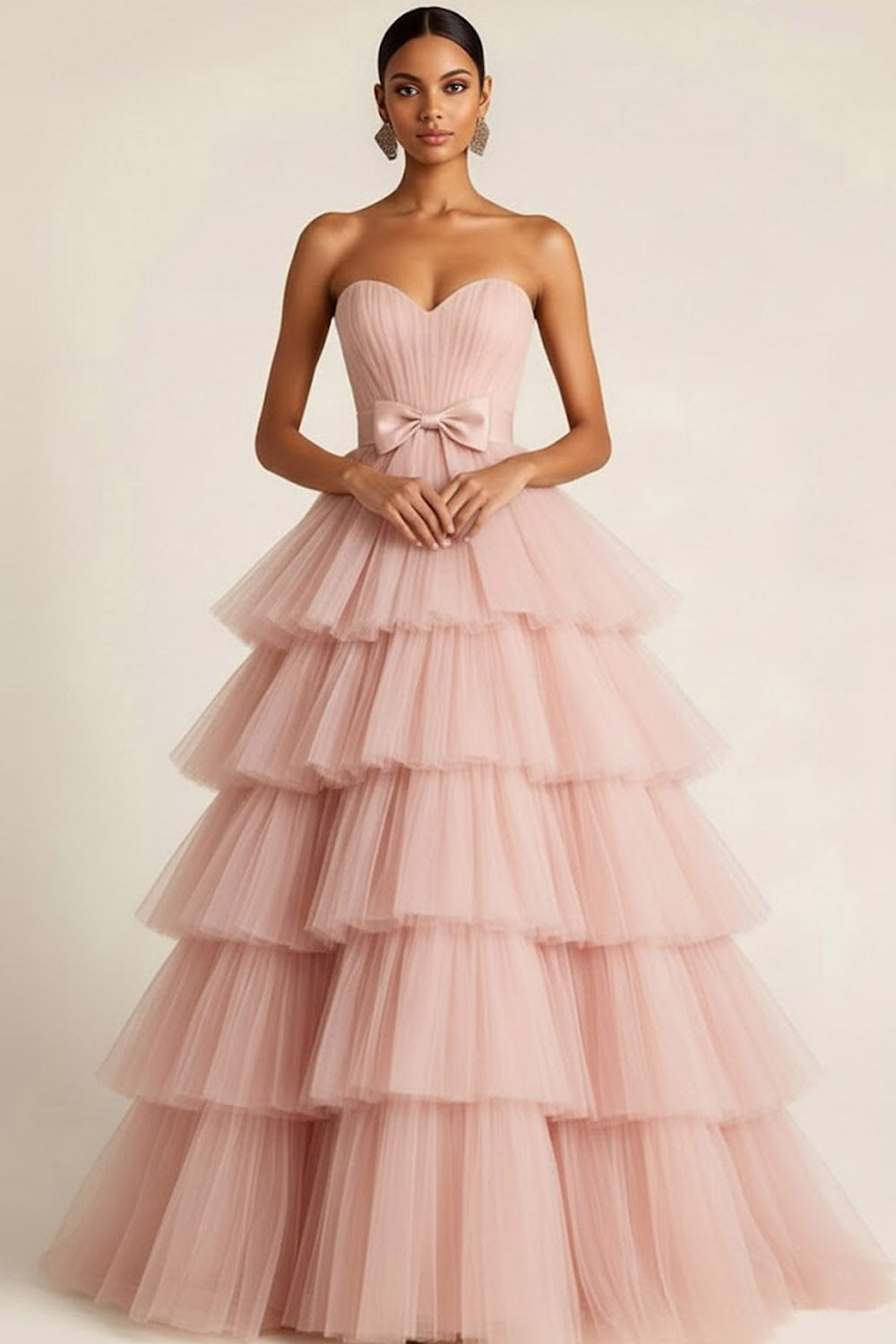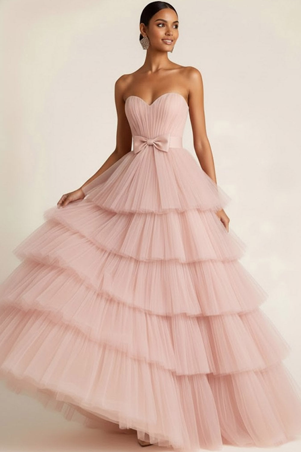 Light Pink Tiered Tulle Ruffled Sweetheart Princess Long Prom Dress