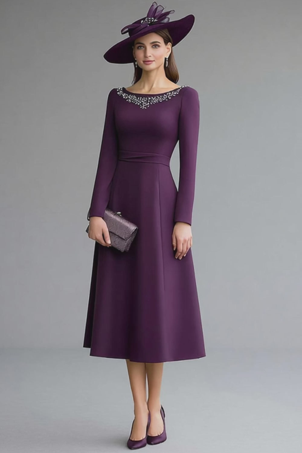 Midi Dark Purple Boat Neck Mother of the Bride Dress with Beading