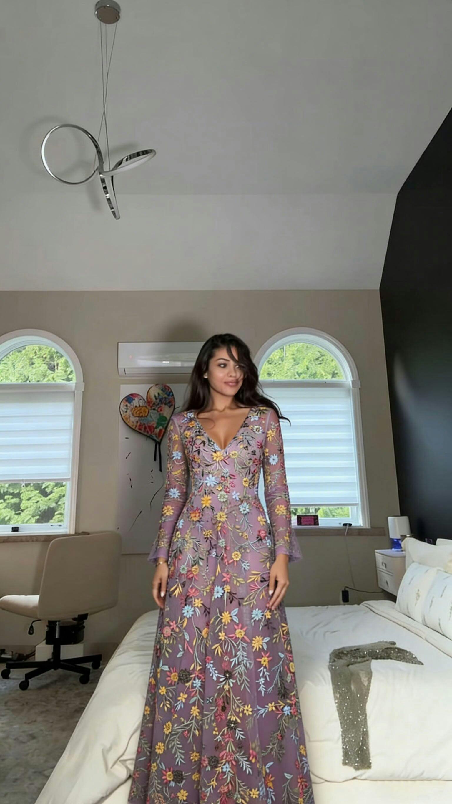 Plus Size Mauve Floral A Line Embroidered Long Sleeves Prom Dress