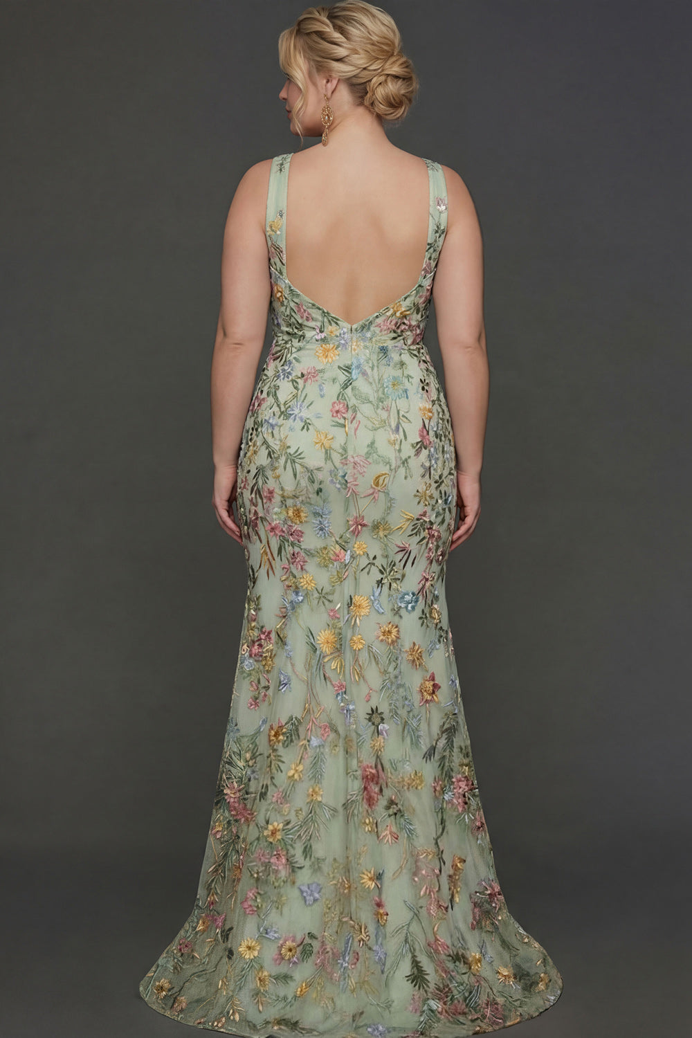 Plus Size Mermaid Criss Floral Mauve Cross Neck Maxi Prom Dress with Embroidery