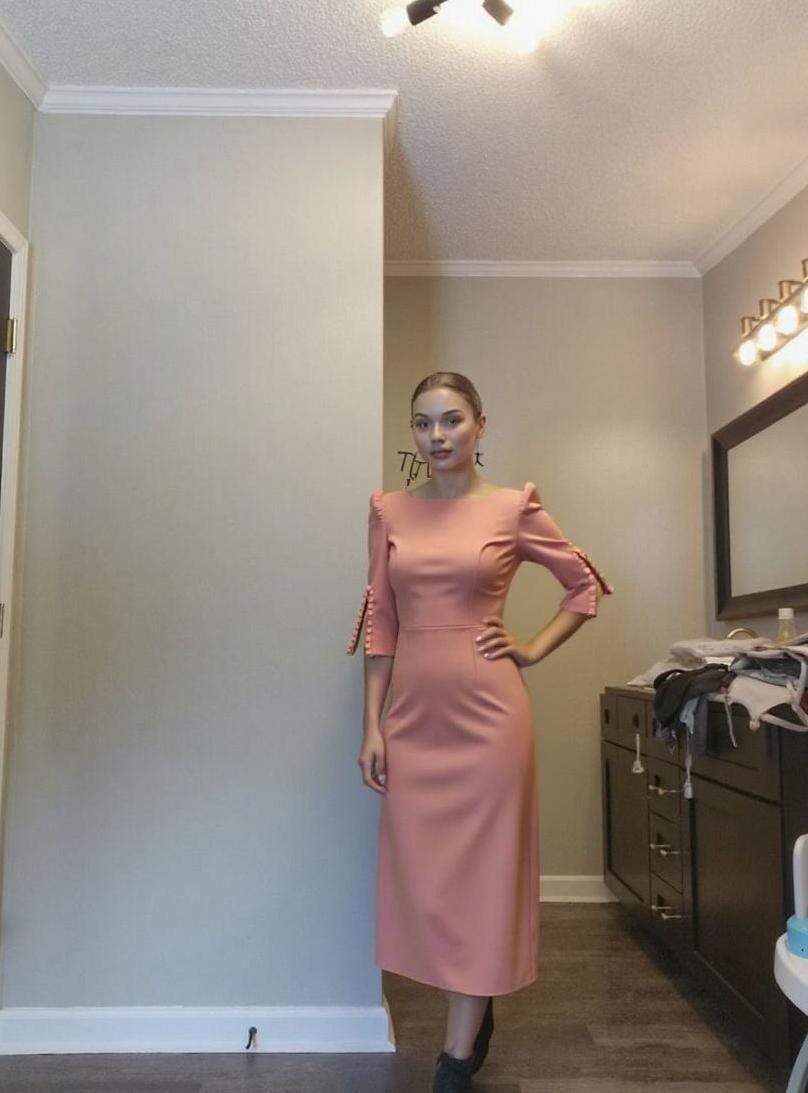 I bought this for my daughter's wedding, and let me tell you--it is the most flattering dress I have had on in YEARS. I actually think it looks better on someone with a figure than on the model. It's very forgiving. Fabric is beautiful. The fabric is thick enough you don't need spanx. Comfortable and so pretty. My biggest challenge will be that I also ordered a gown by the same designer in hunter green that is very similar to this, and it also looks great! I will be keeping them both because this dress can be worn as a wedding guest dress, or to any formal function. Don't hesitate!