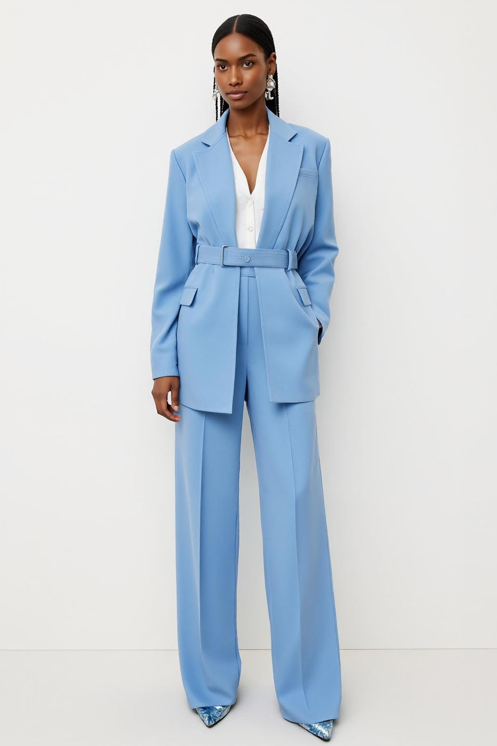 Blue 2 Piece Satin Notched Lapel Women Business Suits with Pockets