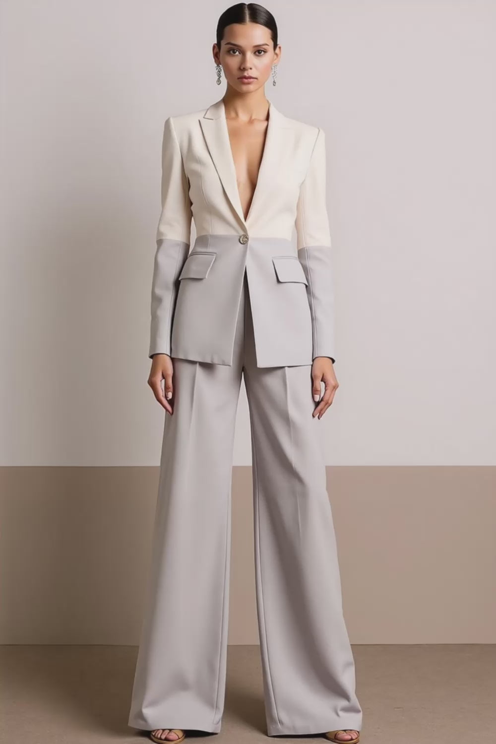 White Patchwork Peak Lapel Wide Leg Women Suits with Sleeves