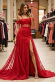 Burgundy Deep V-Neck A Line Maxi Satin Prom Dress with Lace