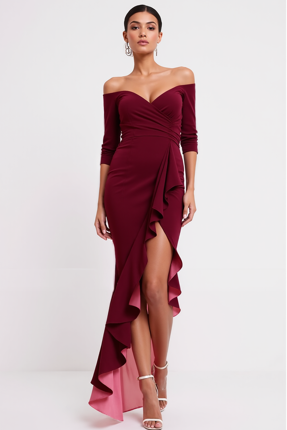 Burgundy Off the Shoulder Sheath Ruffled Formal Dress with Sleeves