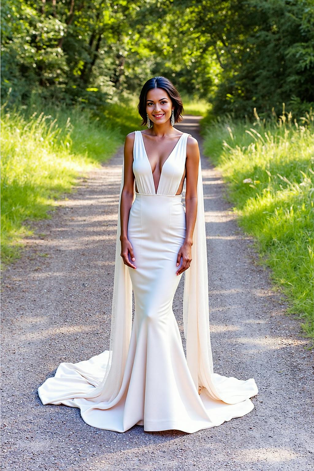 Elegant Ivory Satin Watteau Train V Neck Mermaid Wedding Dress