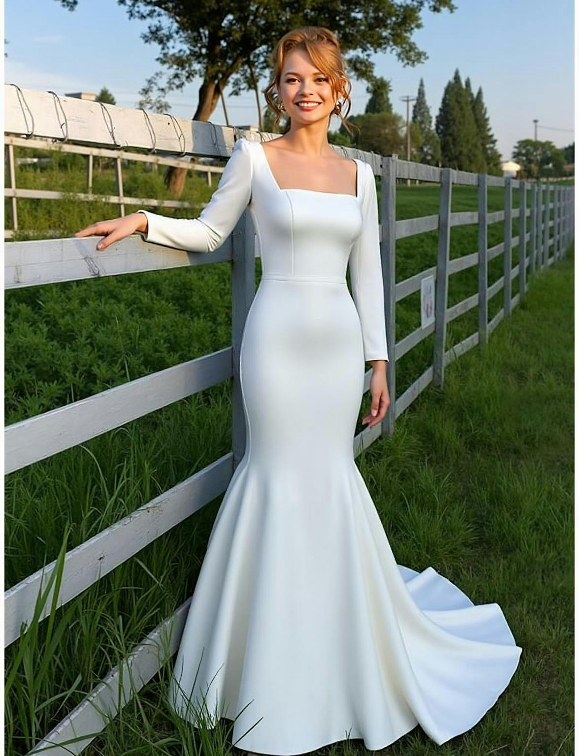 Ivory Mermaid Square Neck Bridal Dress With Long Sleeves