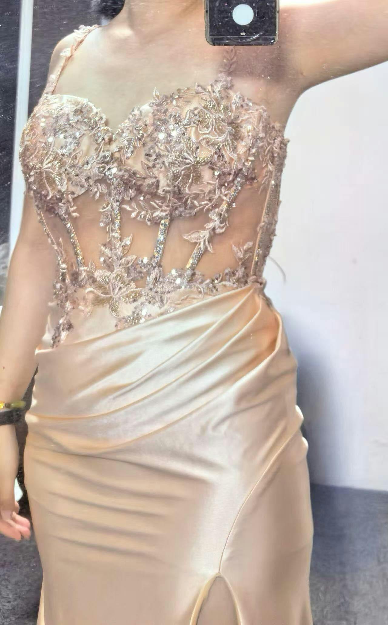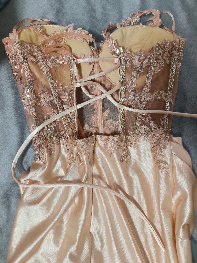 Blush Satin Sequin Corset Maxi Prom Dress with Appliques