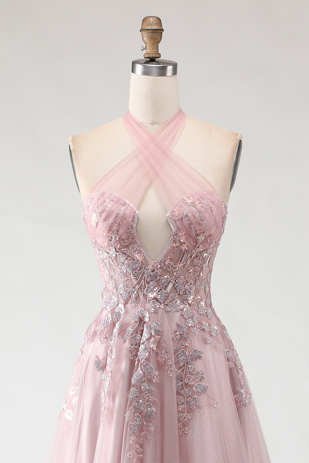 Sparkly Blush Pink A-Line Long Tulle Prom Dress with Appliques