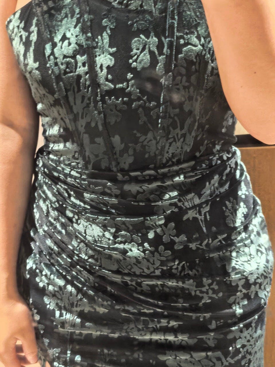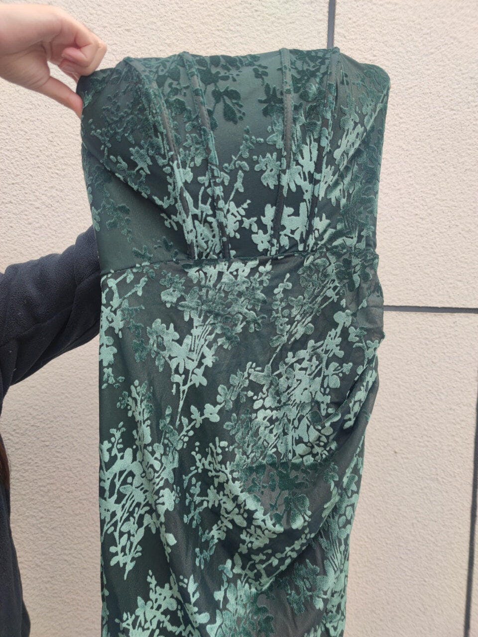 This striking strapless dress in rich peacock green velvet features a structured corset bodice and a graceful thigh-high slit. The column silhouette flows into a floor-length skirt, offering both support and effortless movement. Designed for bridesmaids, its luxurious fabric and bold color ensure a sophisticated look that complements the wedding party beautifully.