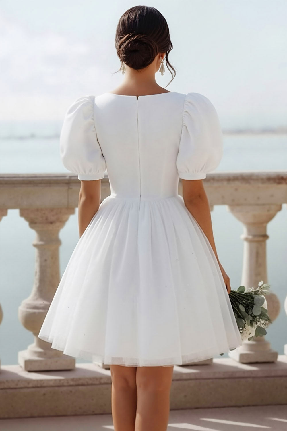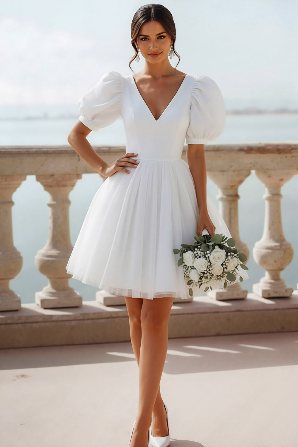 White V-Neck A Line Short Engagement Dress with Sleeves