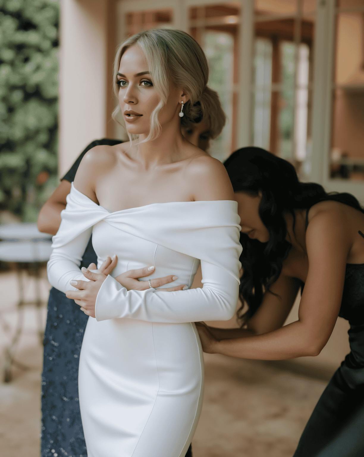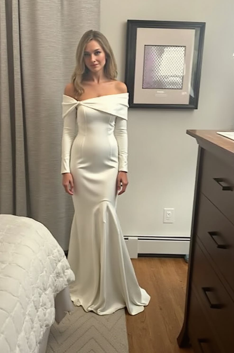 White Satin Off the Shoulder Sheath Maxi Rehearsal Dinner Dress with Sleeves