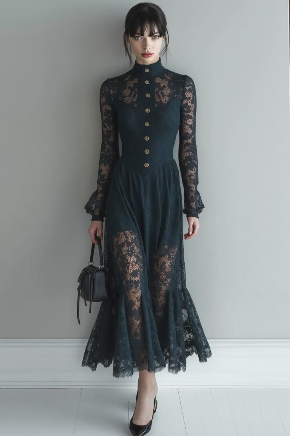 Black Lace High Neck A Line Long Evening Dress with Sleeves