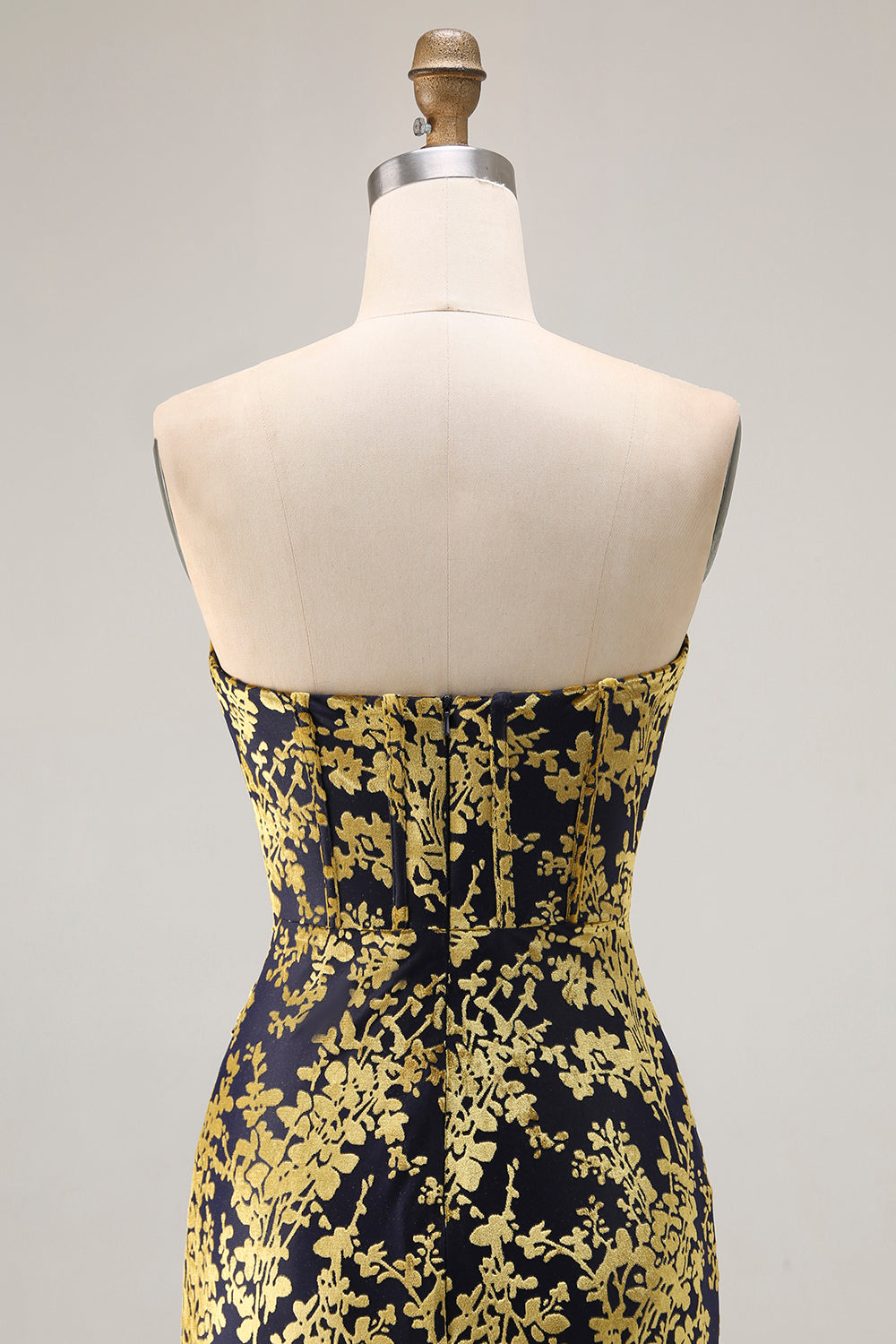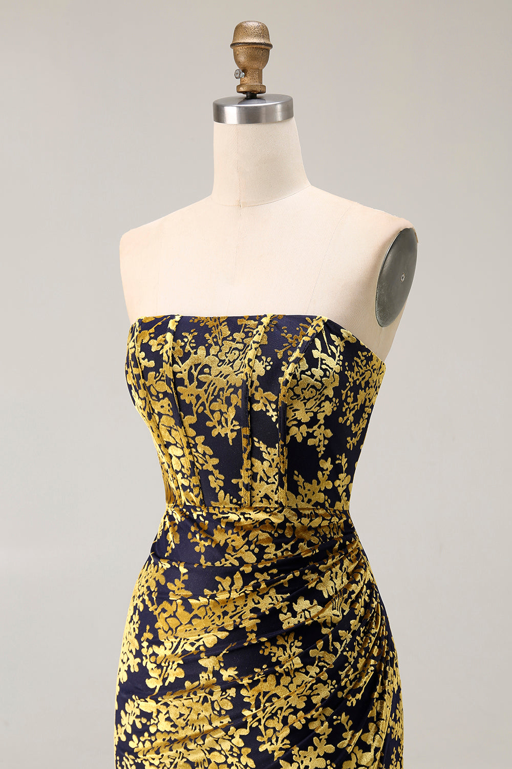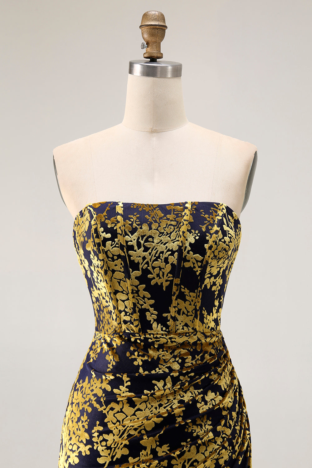 This striking strapless dress in rich peacock green velvet features a structured corset bodice and a graceful thigh-high slit. The column silhouette flows into a floor-length skirt, offering both support and effortless movement. Designed for bridesmaids, its luxurious fabric and bold color ensure a sophisticated look that complements the wedding party beautifully.