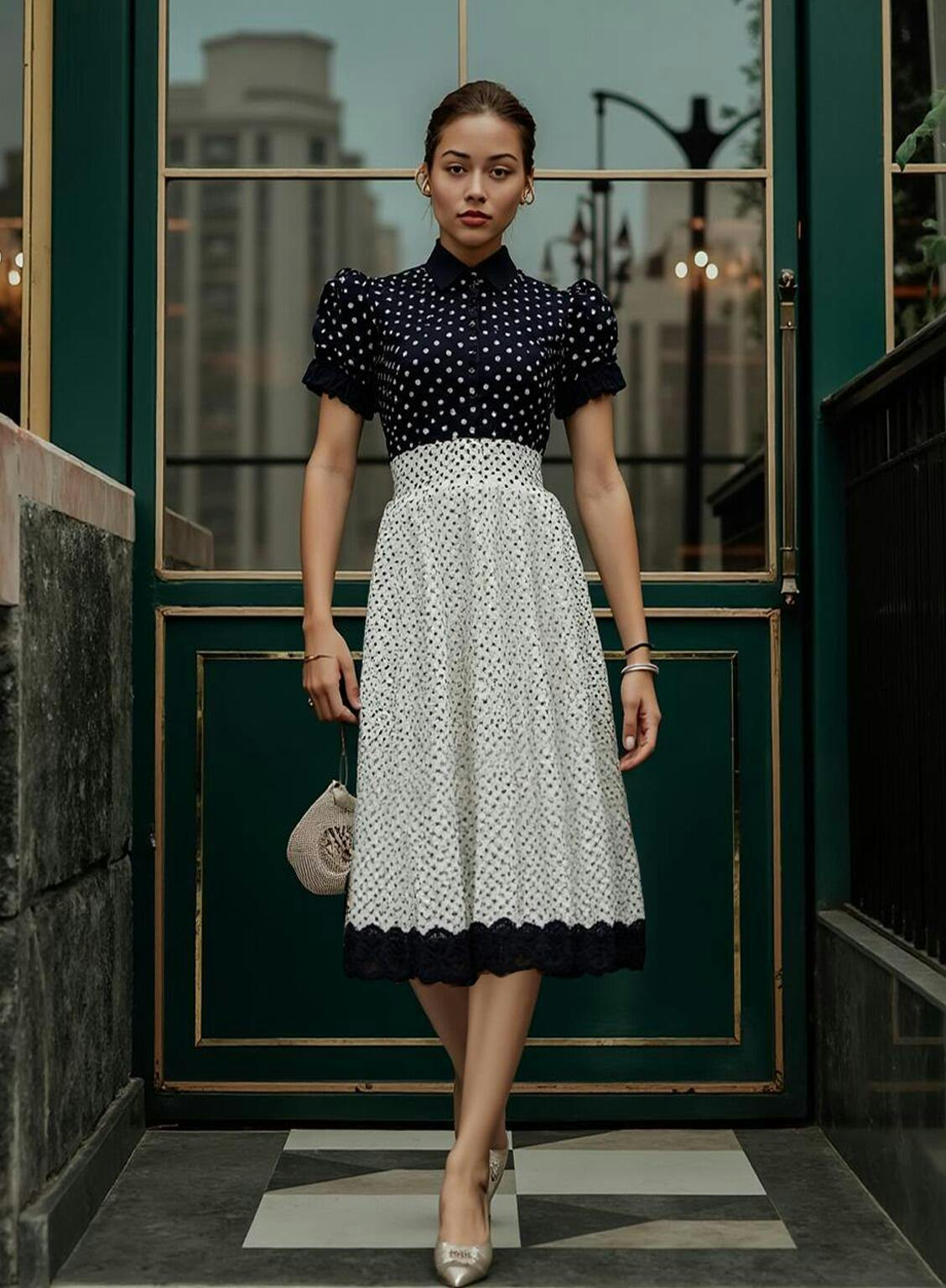Playful yet sophisticated, this polka dot dress is a charming statement piece for any occasion. Crafted from airy chiffon, the dress features a classic black and white polka dot pattern that brings a vintage-inspired flair. The flattering A-line silhouette cinches at the waist and flares gently, offering both comfort and elegance. Delicate ruffle details along the neckline and hem add a soft, feminine touch, enhancing the dress’s romantic appeal. The midi length strikes a perfect balance between casual and dressy, making it ideal for brunches, garden parties, or daytime events. Light, breathable, and effortlessly chic, this dress is your go-to for timeless style with a playful twist.