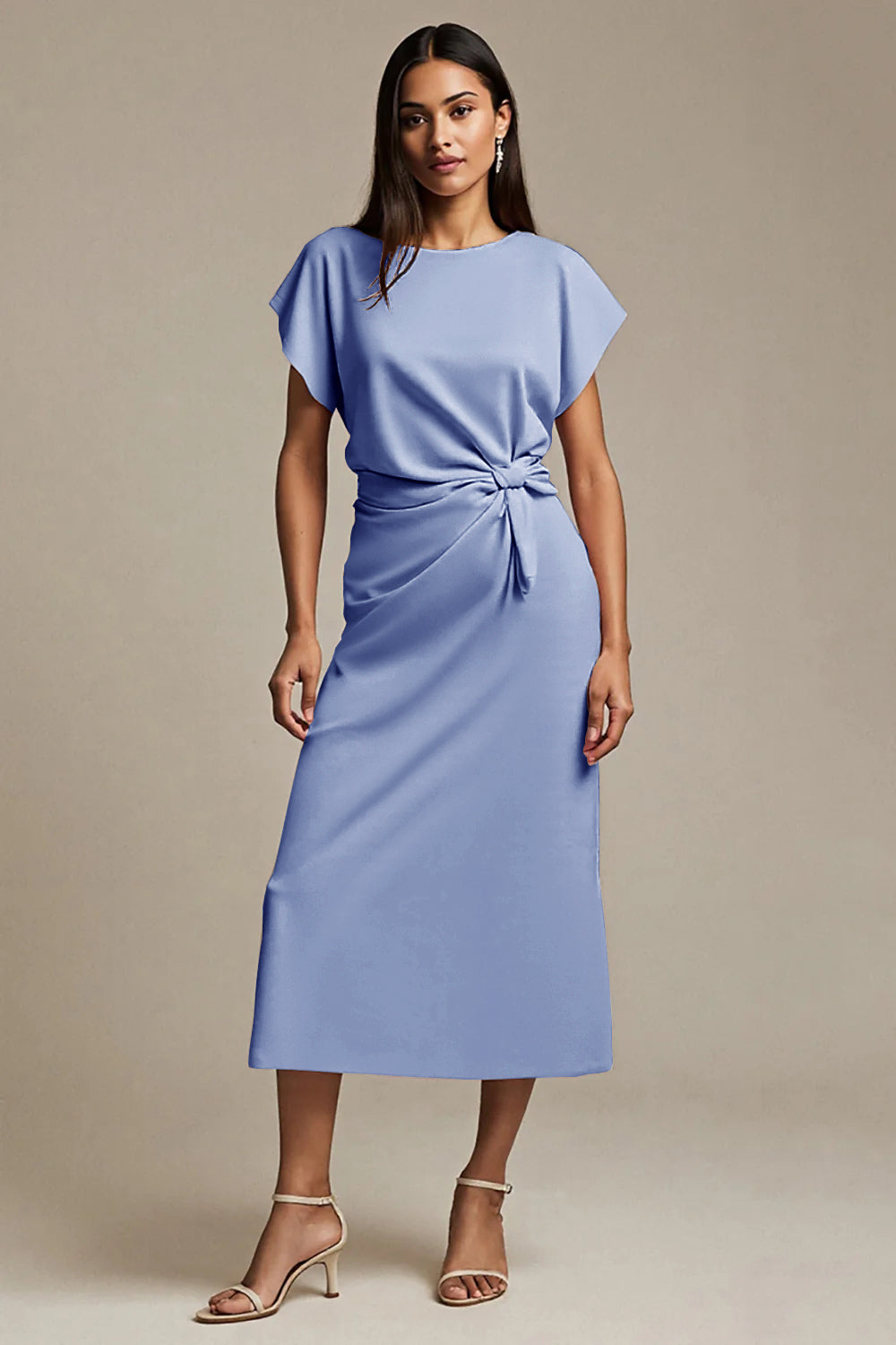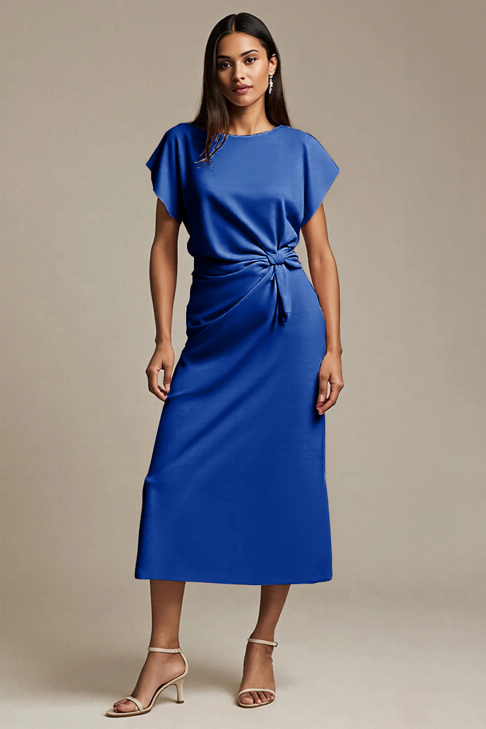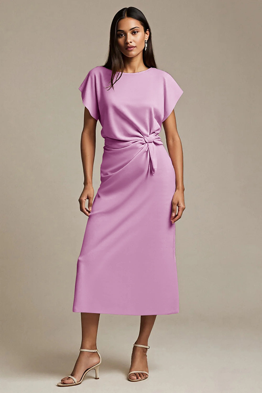 Maxi Pink Boat Neck Satin Ruched Work Dress with Sleeves
