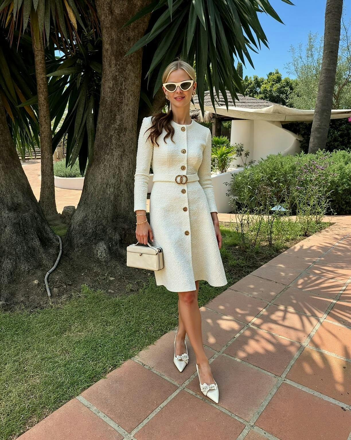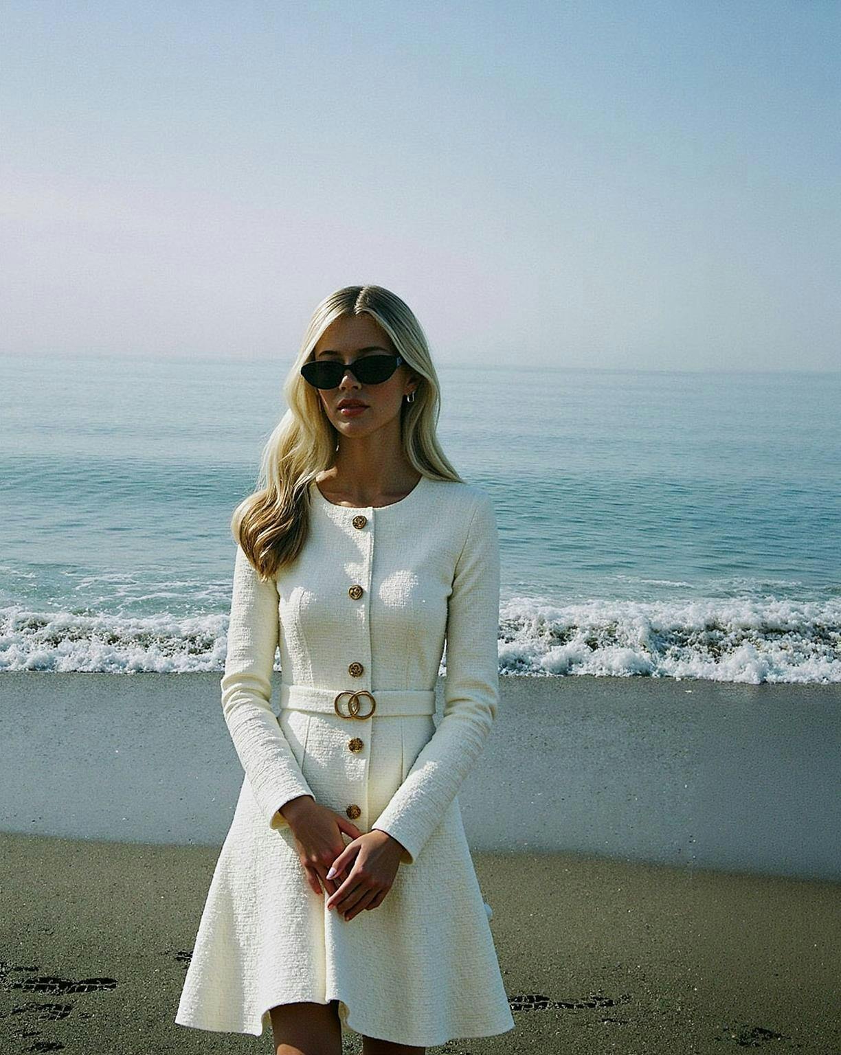 This elegant midi dress in ivory tweed features long sleeves and a round neck for timeless office wear. The tailored silhouette is accentuated by a matching self-tie belt that defines the waist gracefully. Crafted from textured tweed fabric, the design offers both structure and comfort with its knee-length cut and refined finish. Ideal for professional settings, it combines practical long sleeves with sophisticated detailing for a polished appearance.