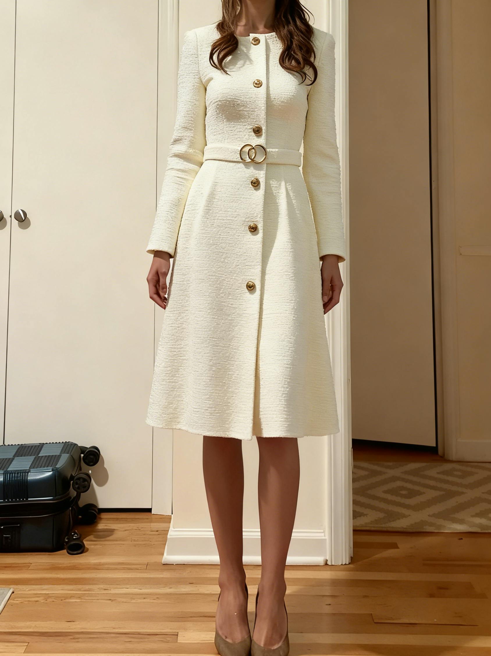 Tweed Ivory Long Sleeves Round Neck Midi Work Dress with Belt