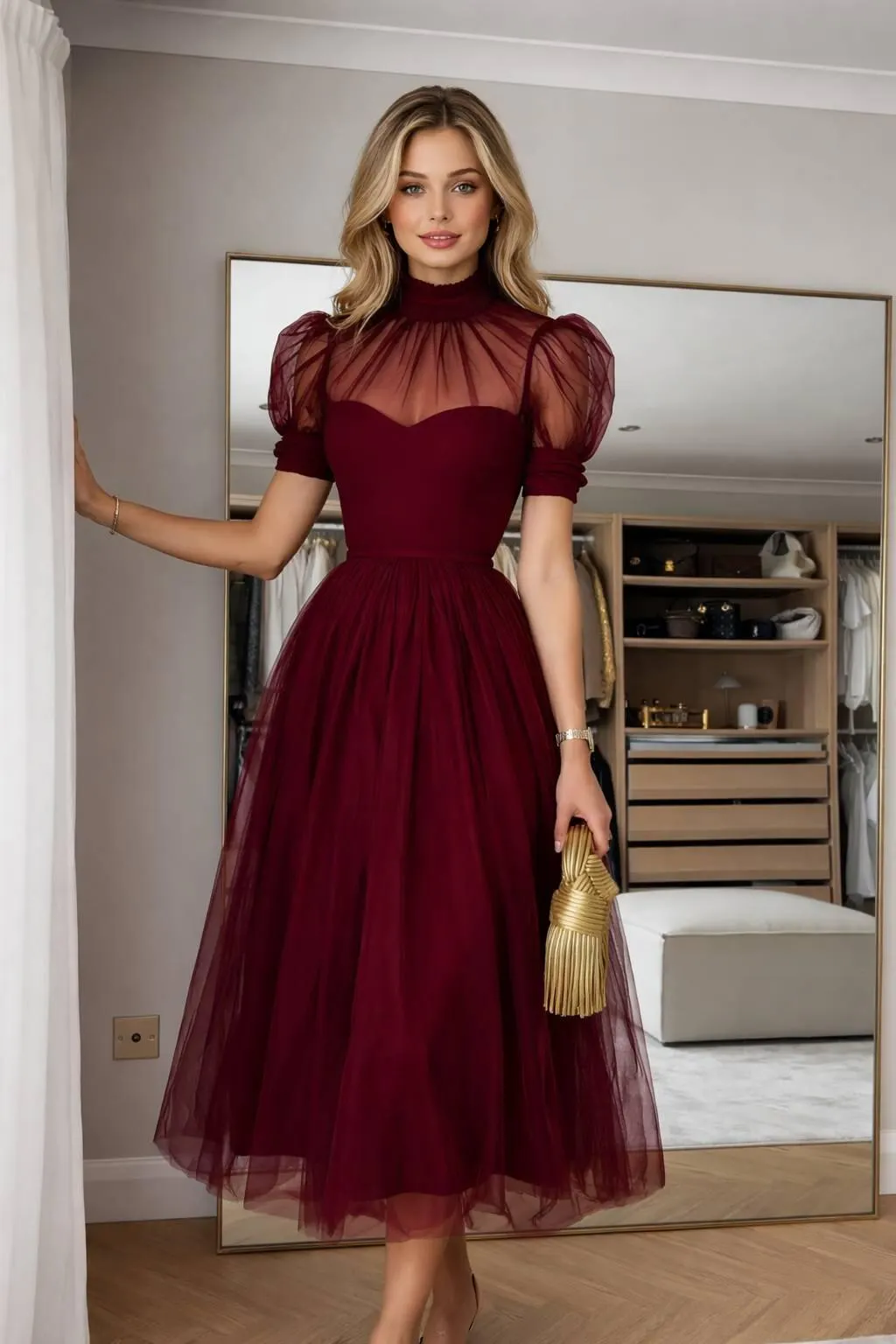 I absolutely love this dress! The high neck gives it a sophisticated look, while the A-line silhouette is so flattering. The pockets are a huge bonussuper convenient without ruining the shape. Perfect for formal events!