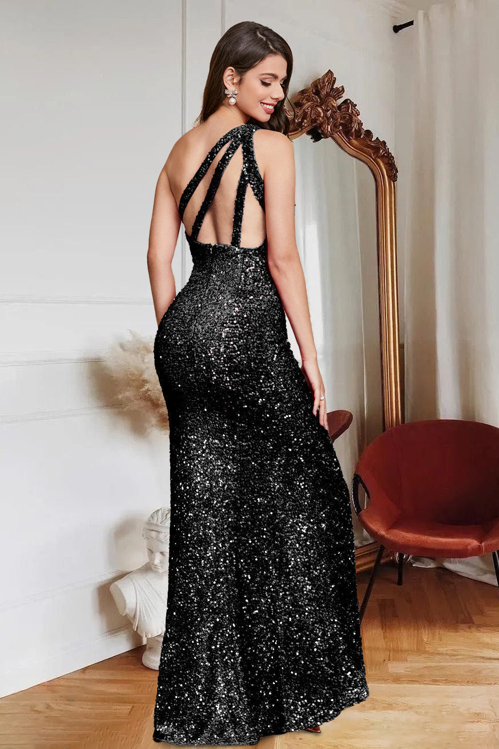 Glitter Royal Blue Mermaid One Shoulder Sequins Prom Dress With Slit