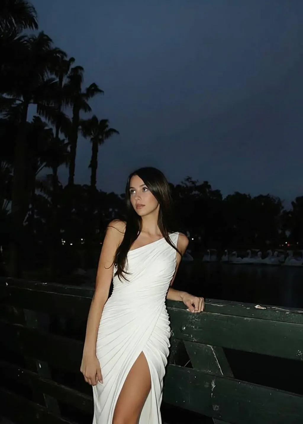 Radiating effortless charm, this dress is a dreamy choice for seaside celebrations or romantic outdoor moments. The elegant one-shoulder neckline brings a modern asymmetrical touch, while the ruched bodice flatters the figure with gentle texture and definition. Crafted from airy chiffon, the flowing maxi skirt drapes beautifully with every step, creating a light, ethereal silhouette perfect for a beach setting. A thigh-high slit adds a hint of allure and allows for easy movement, balancing grace with a subtle edge. This dress is a stunning blend of softness and sophistication, ideal for brides-to-be who want to feel both free-spirited and chic on their special day.