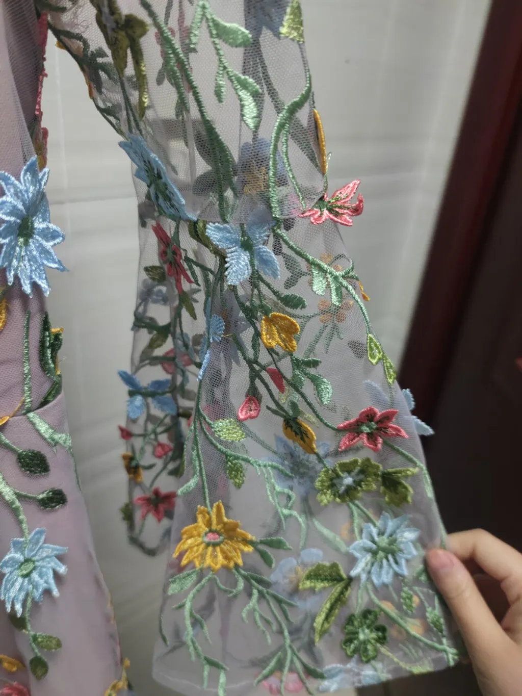 Mauve Floral A Line Embroidered Flutter Sleeves Long Prom Dress