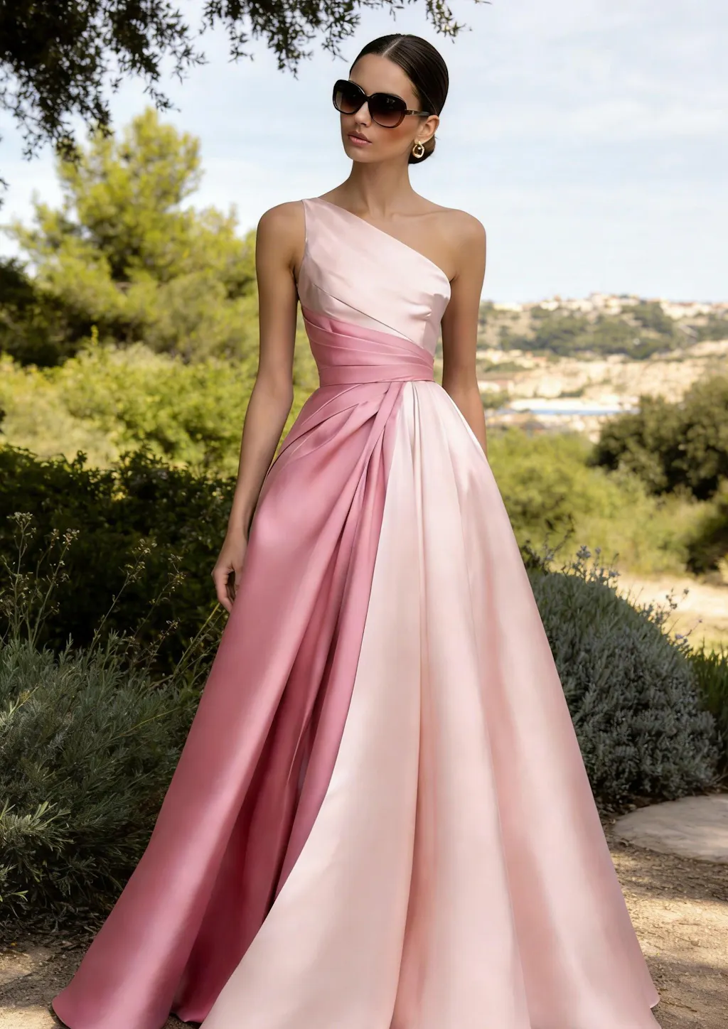 This elegant maxi dress in soft pink satin features a graceful one-shoulder neckline and a flowing A-line silhouette. The luxurious fabric drapes beautifully, catching the light with a subtle sheen as it falls to a full-length hem. Designed for formal occasions, the dress combines a fitted bodice with an effortlessly flaring skirt, creating a timeless and feminine profile perfect for black-tie events or galas.