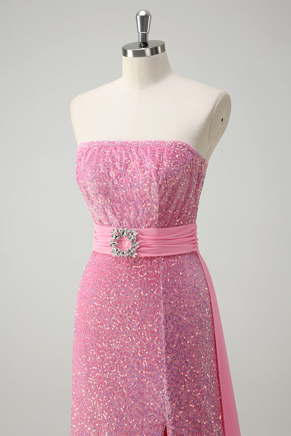 Pink Strapless Sequined Side Cape Column Prom Dress with Slit