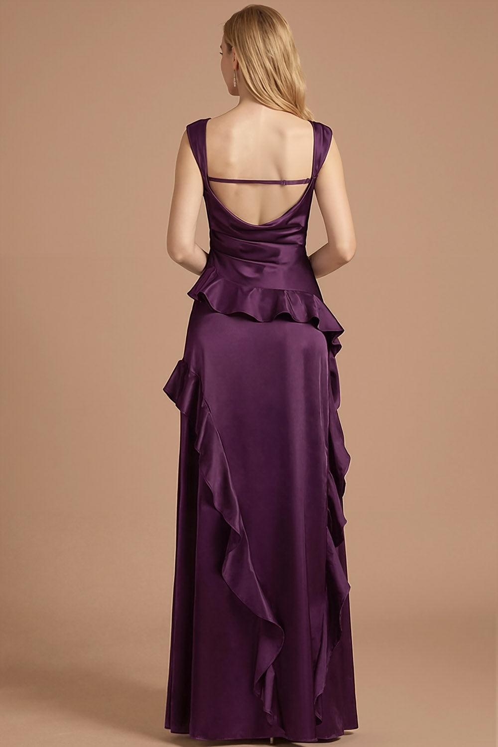 Satin Purple Sheath Ruffled Thick Straps Long Wedding Guest Dress with Slit